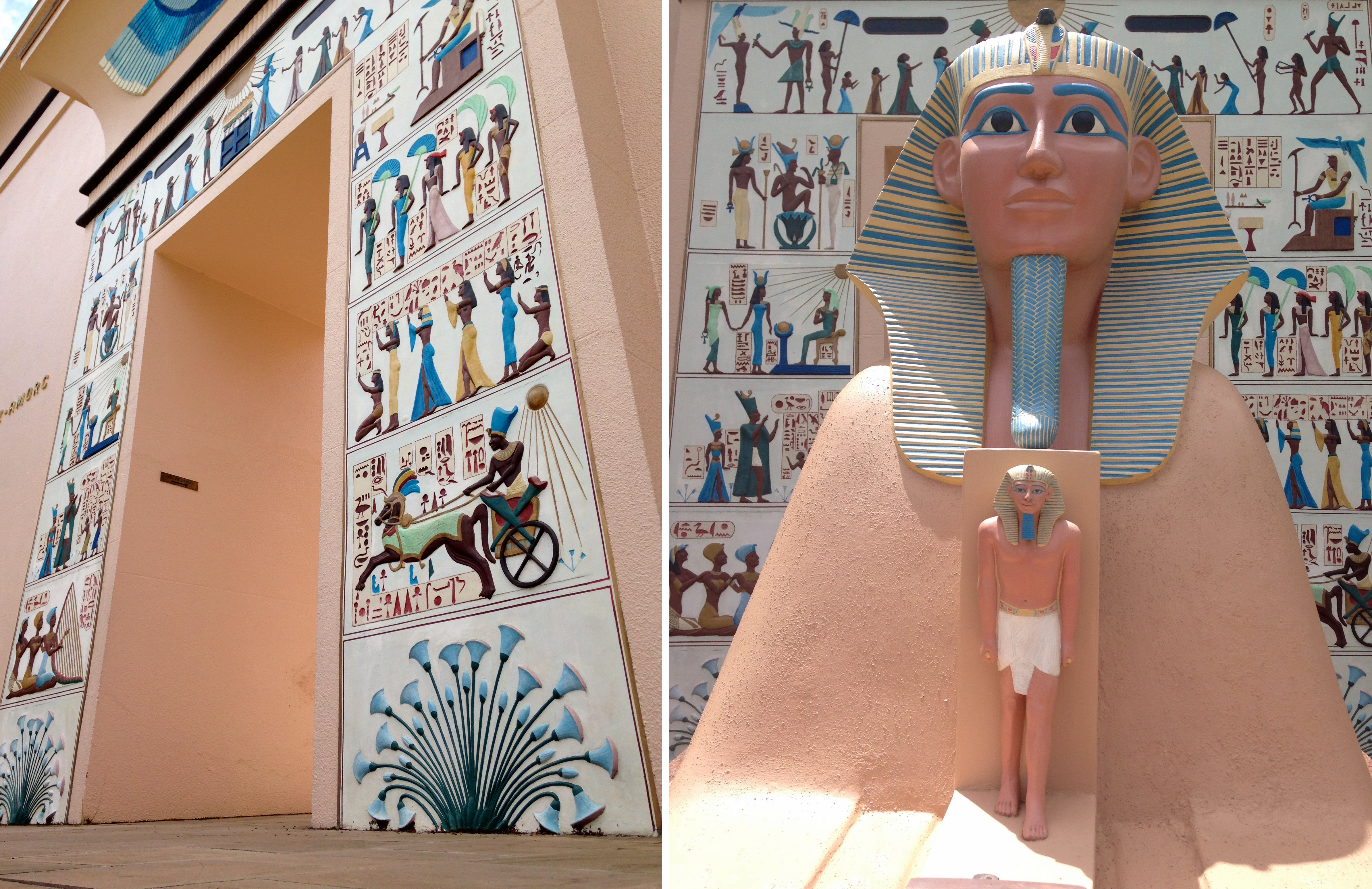 A História do Antigo Egito é contada através de réplicas idênticas de peças que estão expostas em museus de todo o mundo. Do lado de fora, uma esfinge e uma pequena pirâmide.